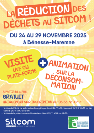 Du 24 au 28 novembre prochain, à l’occasion de la Semaine Européenne de Réduction des Déchets (SERD), le Sitcom vous ouvre ses portes et vous propose des animations à Bénesse-Maremne.